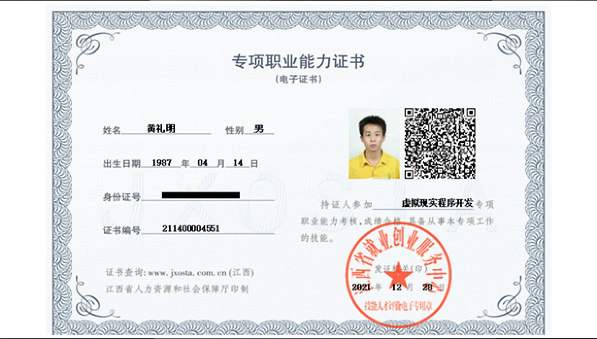 我司刘仁助、倪飞、黄礼明等三人顺利获得江西省虚拟现实专项职业能力证书考试并取得证书。