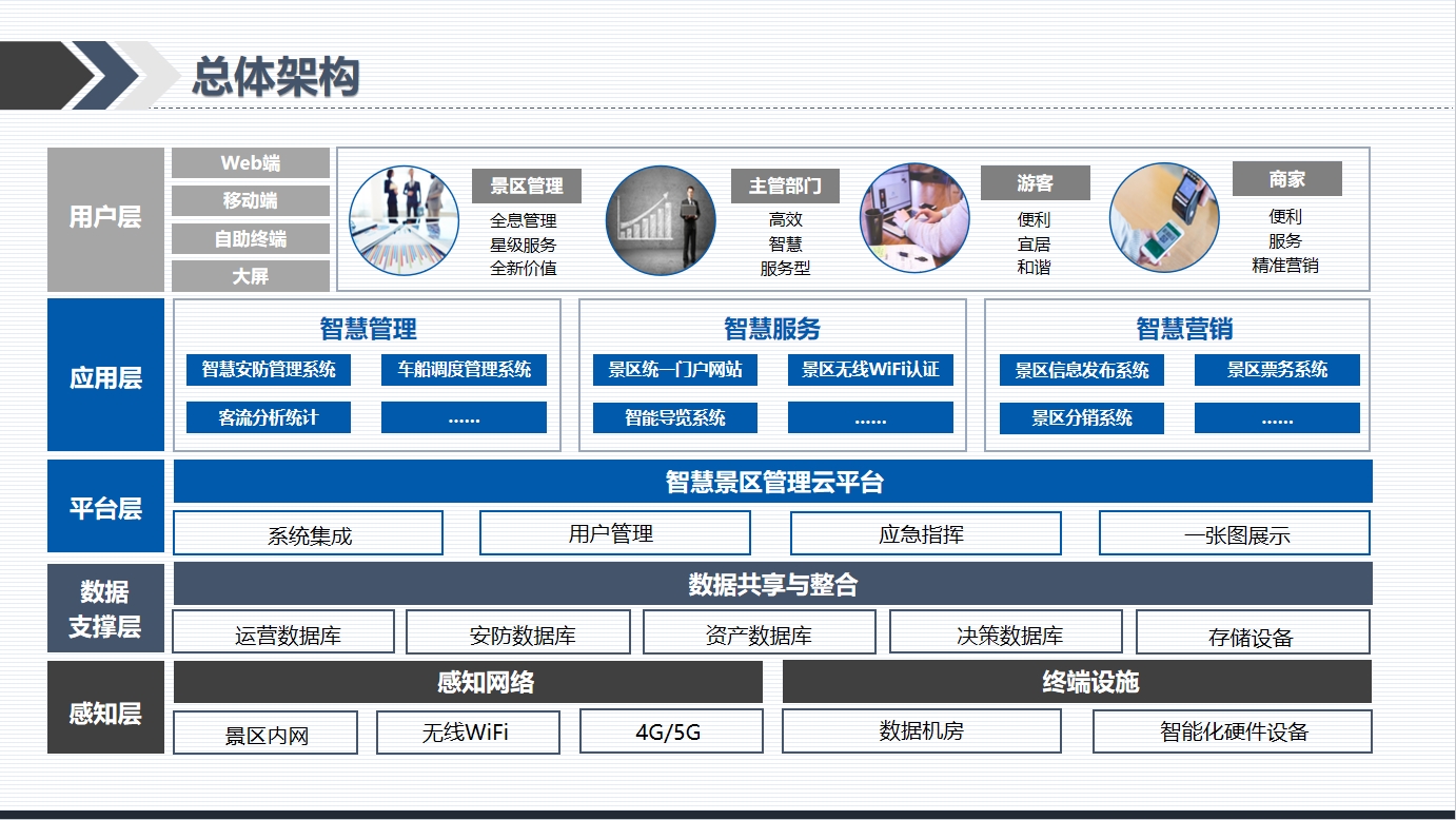1.全面物联——智能传感设备将旅游景点、文物古迹、公共设施、商业单位物联成网,对旅游产业链上下游运行的核心系统实时感测。